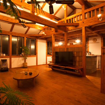 中に入ると、落ち着いた色の無垢の集成材の柱や梁、床や階段が、白い壁としっくりとマッチして、癒しの雰囲気が漂っています。小じんまりとした小上がりの畳スペースに造作のダイニングやキッチンなどの家具、隠れ家やキッズスペースとして利用できそうなロフトなど、提案もいっぱい。家族の成長に合わせて間取りも変化させられる工夫も盛り込みました。リビングに大きくとった窓から見える城山のグリーンが、まるで絵画のような趣。別の窓からは桜島を望むこともでき、立地を存分に活かした間取りが魅力の家になっています。