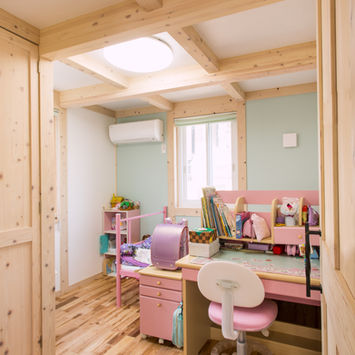 “家族や親せきが集まった時、にぎやかに過ごせる空間を”と、LDKは大きなダイニングテーブルが置けるほど広々。ホワイトカラーの木のぬくもりが温かく、陽だまりのようなリビングになりました。道路から一段高くして、1階にもバルコニーを設置。その下を自転車置き場にし、スペースを有効活用しています。2階は、ママと娘さんたちのプライベート空間。「自分の部屋が欲しい」との希望を叶えた子ども部屋は、ペールピンクとブルーのクロスで色分けしています。各部屋にウォークインクローゼットをつけ、収納もたっぷりと。ピンクのお風呂にデニムクロスのトイレなど、“かわいいがいっぱい”です。